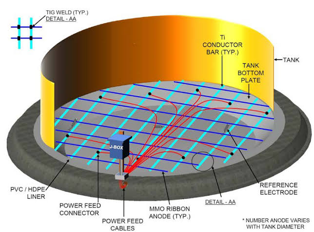 Systems come in a variety of configurations depending on the tank construction, which include; peripheral anodes, mesh anodes, existing floor anodes and carbon disc anodes. For the interior of the tank, rod or bar anodes are commonly used.